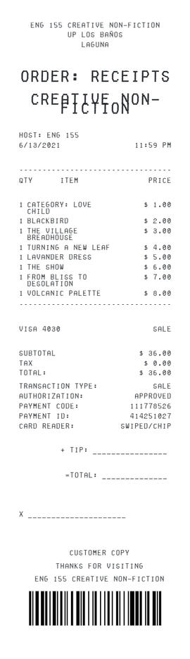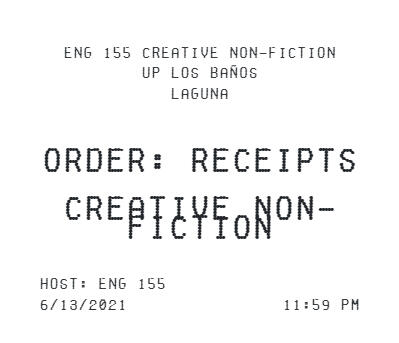RECEIPTS is a collection of Creative Non Fiction essays by ENG 155 students of UP Los Baños. Under the supervision of Prof. John Toledo, the pieces were mindfully crafted and workshopped in a span of a month, and are now ready to be unveiled.